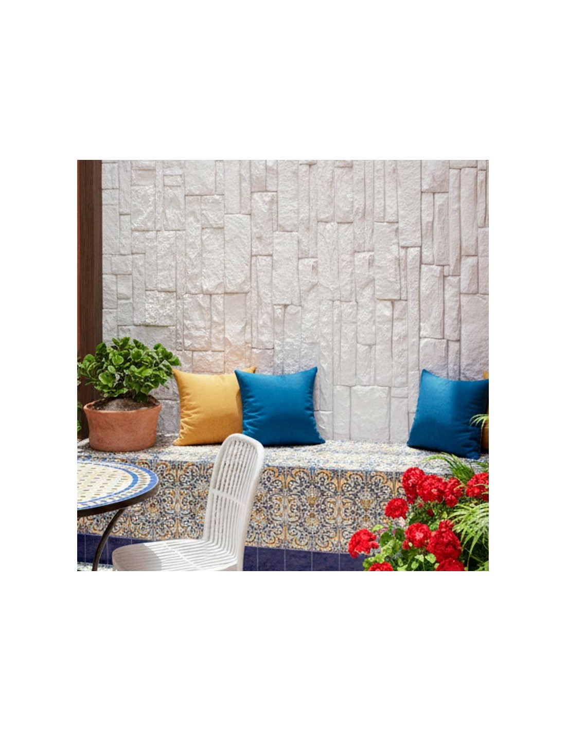 La piedra pu blanca es una solución decorativa perfecta para revestir paredes exteriores y conseguir un acabado efecto piedra natural con un estilo limpio y luminoso. Su diseño tipo piedra laja aporta textura y profundidad, creando fachadas con personalidad y un aspecto muy cuidado sin necesidad de obras complicadas.
