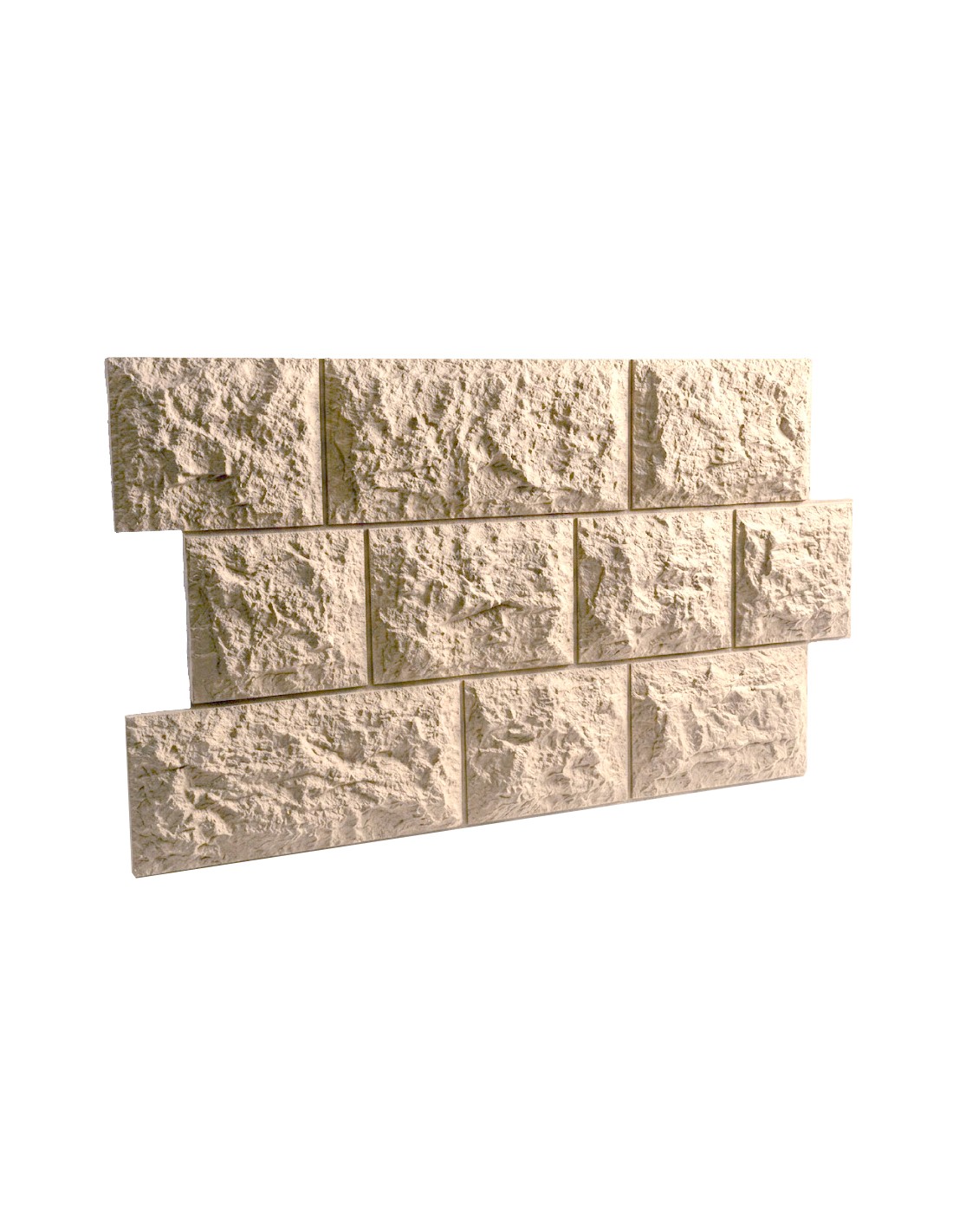 Panel decorativo de piedra PU rústica beige, perfecto para revestir paredes exteriores con un acabado natural y con volumen. Fabricado en poliuretano, es ligero, resistente al agua e ignífugo, y su formato de 125 x 75 cm facilita una instalación rápida y limpia.