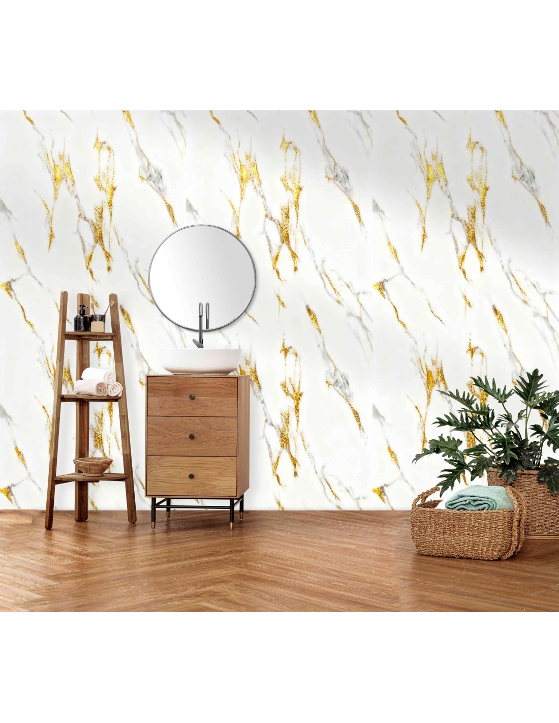 Su diseño parte de un fondo blanco brillante que se combina con vetas suaves en tonos gris y delicados trazos de oro holográfico, aportando un toque de lujo sutil y cambiante. Estos reflejos dorados reaccionan a la luz, generando matices elegantes que enriquecen la superficie sin restar ligereza visual al conjunto.