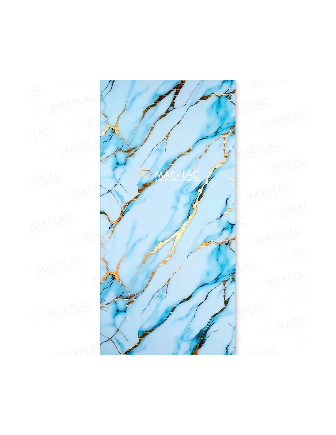 La placa cielo azul transmite sensación de amplitud y serenidad gracias a su fondo azul suave, que recuerda a superficies minerales claras y espacios abiertos. Sobre esta base aparecen vetas de oro holográfico que recorren la superficie de forma orgánica, aportando brillo dinámico y un contraste visual delicado pero muy llamativo.