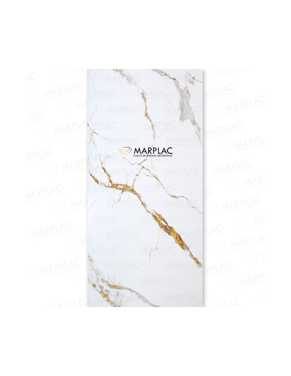 Placa decorativa con acabado efecto mármol blanco veteado en tonos café y dorado. Ideal para revestimientos de paredes, muebles o mostradores. Aporta elegancia y modernidad a cualquier espacio interior. Fácil de instalar, resistente y lista para transformar tus proyectos de decoración.