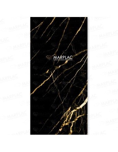 Placa decorativa Mármol Nigeria de 260x122 cm con espectacular acabado brillo. Diseño elegante en negro con vetas doradas que aporta lujo y sofisticación a cualquier ambiente interior. Ideal para revestimientos de paredes en salones, comercios o espacios exclusivos. Solo apta para uso en interiores.