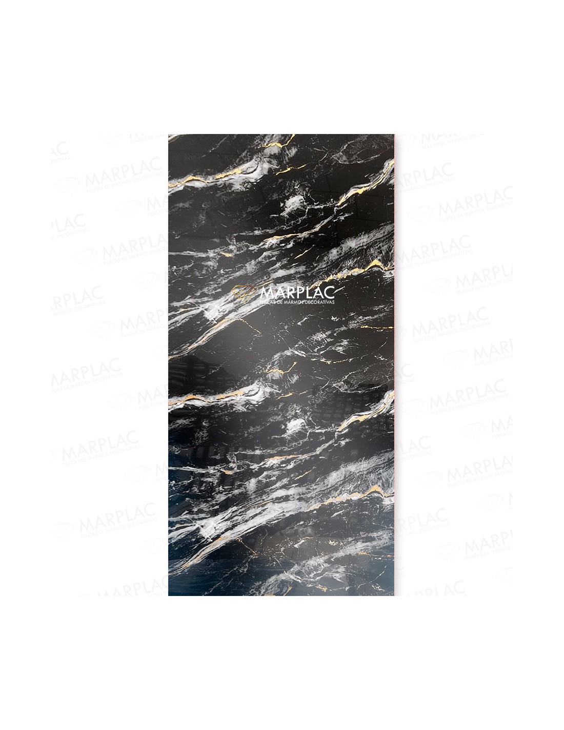 Placa decorativa negro lujo con un diseño espectacular que combina fondo negro intenso con vetas blancas y detalles dorados, perfecta para crear espacios exclusivos y de alto impacto. Con un grosor de 3 mm, permite un acabado elegante manteniendo una instalación cómoda.