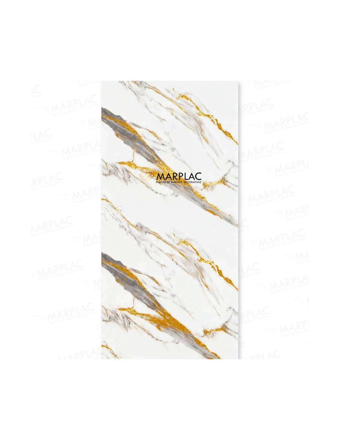 Acabado en blanco con vetas en tonos grises y dorados que aportan luz y elegancia a cualquier espacio. Esta placa decorativa en brillo destaca por su estética limpia y su grosor de 3 mm, facilitando una colocación rápida y precisa.