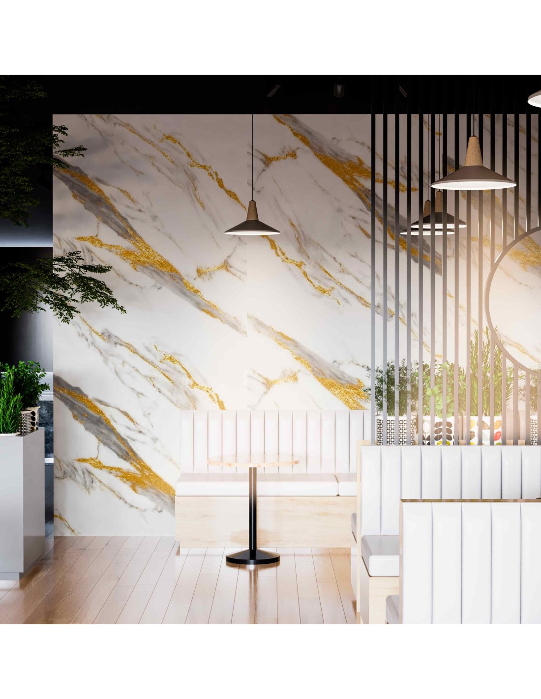 La placa blanco sueño dorado brillo es perfecta para quienes buscan un ambiente luminoso con un toque sofisticado. Su base clara combinada con vetas suaves y reflejos dorados crea un efecto visual muy elegante, ideal para salones, dormitorios o zonas donde se quiera potenciar la sensación de amplitud.