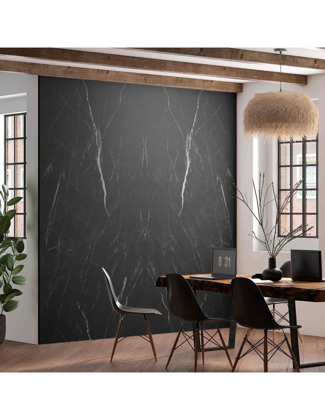 Granito semi mate es una placa decorativa con un peso aproximado de 20 kg por pieza, diseñada con fondo oscuro y vetas claras que aportan contraste. Su acabado semi mate reduce los reflejos y consigue una pared elegante, actual y con una presencia muy marcada.